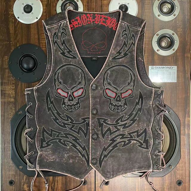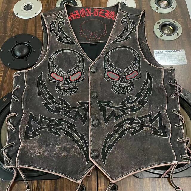 ベストの背面には、真骨彫りのドクロのデザインが施され、一瞬で他のバイカーファッションとは一線を画す存在感を放ちます。