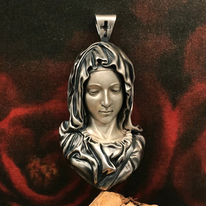職人の手によって一つ一つ手彫りされた、オマージュカミケランジェロの彫像が描かれたペンダントネックレスです。スターリングシルバーで作られており、男女兼用となっています。繊細な彫刻が施されたこのペンダントは、そのデザインだけでなく、歴史的な価値も備えています。