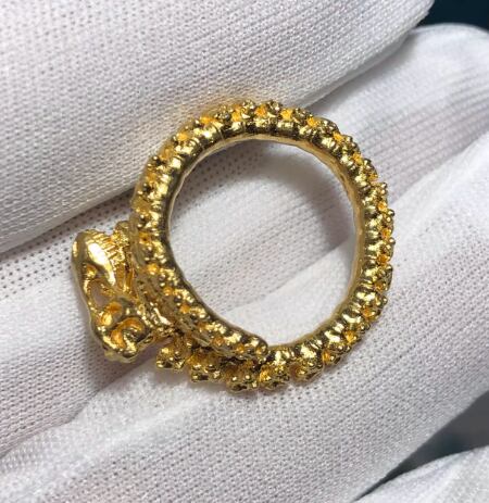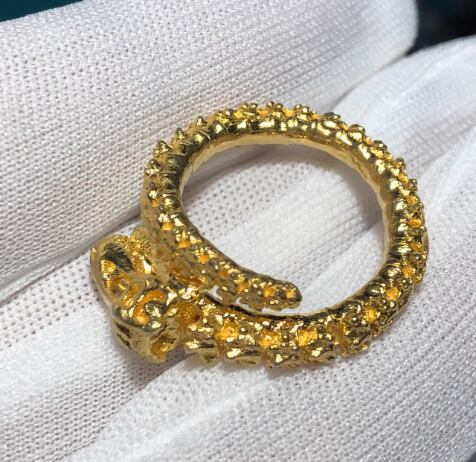 24Kゴールドで作られたスケルトンデザインは、ダークでクールな印象を与えます。そのデザインは、恐竜の骸骨のようでありながら、その歴史的な価値を垣間見せてくれます。このリングを身に着けることで、個性的で強力なイメージを演出できるでしょう。