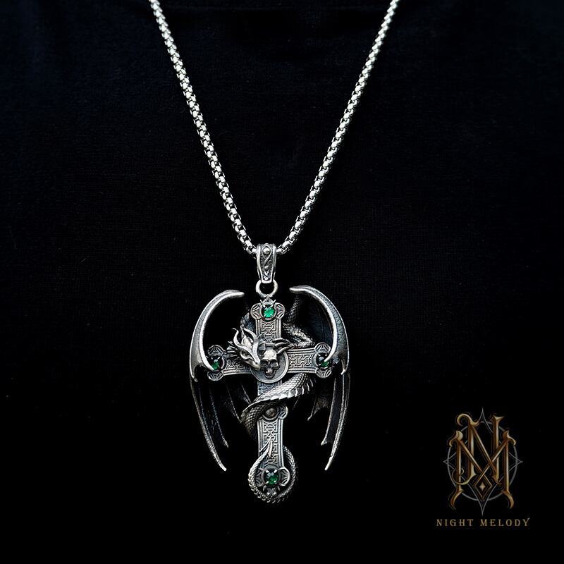 Nocturne Studio 925 スターリングシルバーオリジナルデザインハンドメイドパーソナライズレトロゴシックエメラルドドラゴンクロスペンダントは、唯一無二のデザインとハンドメイドの技術が融合した特別なアクセサリーです。エメラルドドラゴンのモチーフがクールで個性的。レトロゴシックな雰囲気が、あなたのスタイリッシュなファッションにアクセントを添えます。