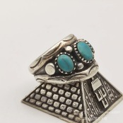 1980年代のアメリカ、インディアナ州のオアホー族が作った特殊形状リングです。男性用サイズ20で、天然のターコイズとスターリングシルバーが素材として使用されています。アメリカンレトロの雰囲気が漂うこのリングは、その独特なデザインとカラフルなターコイズが特徴です。