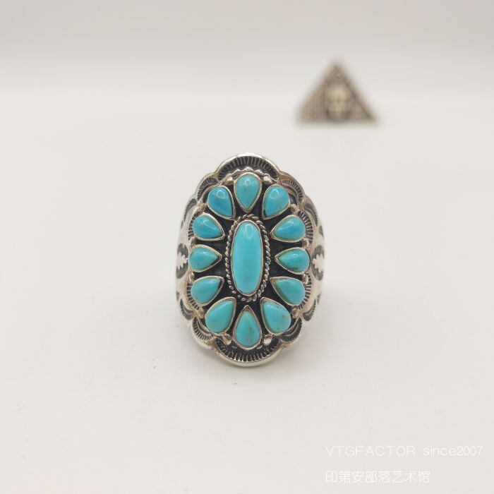 アメリカンインディアナ Oaho Tribe 天然ターコイズ 925 スターリングシルバースタンダードアメリカンレトロリング男性用サイズ 24