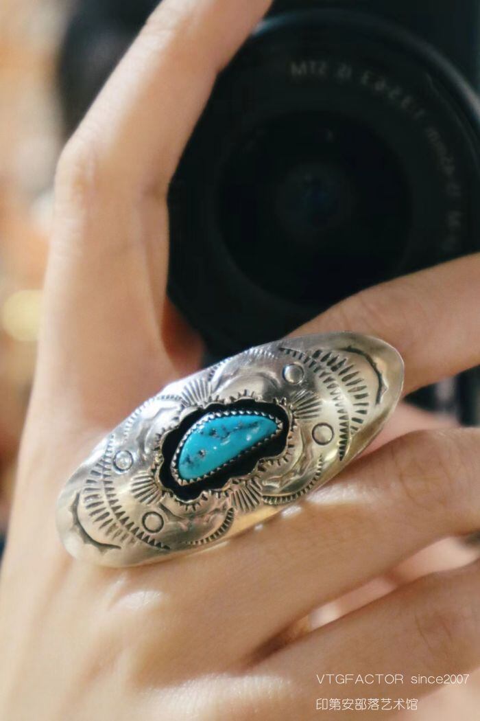 1970年代に作られたインディアナオアホ族のアーティストによる天然ターコイズのスターリングシルバーリングです。独特のシャドーボックスデザインが特徴で、女性用のサイズ17となっています。
