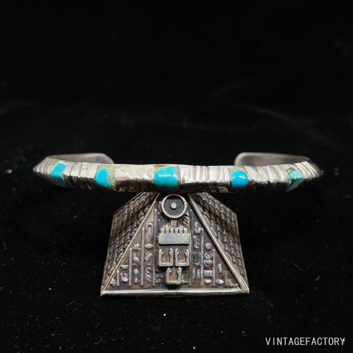 アメリカンインディアナオアホ族の伝統的な手作り技術を活かして制作された、1960年代のレトロな雰囲気を持つバングルブレスレットです。天然のターコイズを使用し、トライアングルの形状が魅力的なデザインとなっています。シルバー素材はスターリングシルバーを採用し、上品で耐久性にも優れた一品です。