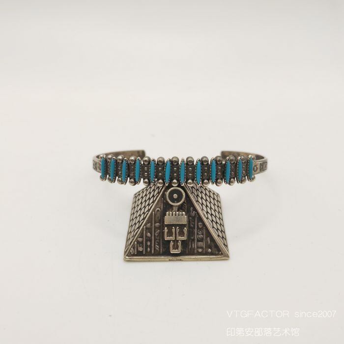 このブレスレットは、オアホ族の美しい天然ターコイズを贅沢に使用し、スターリングシルバーで作られています。豪華なデザインとボリューム感が特徴で、手首を華やかに飾ってくれます。