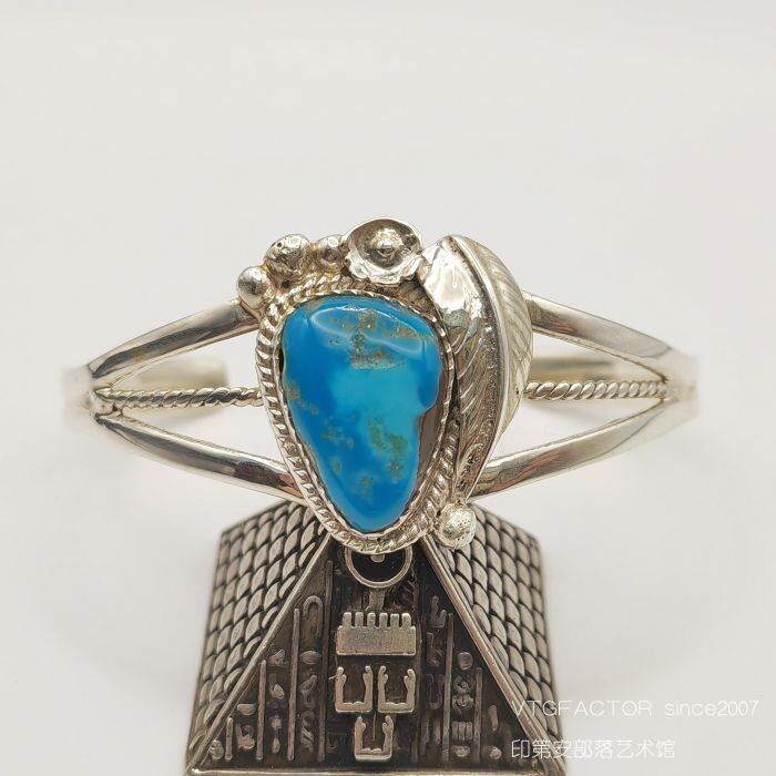 インディアナ州オアホ族の職人が手作りした、天然ターコイズを使用したシルバーラベルのアメリカンレトロブレスレットです。多目的に使えるデザインでありながら、個性的な存在感を放ちます。ターコイズの美しいブルーカラーが、着ける人の手首を優雅に飾ります。