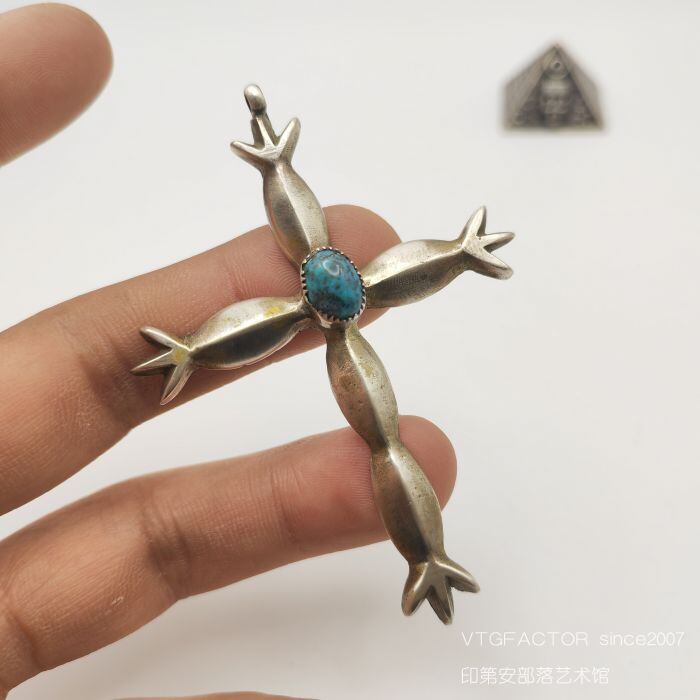 1960年代インディアナワジョトライブナチュラルターコイズレイニーサンドキャストクロススターリングシルバーラージペンダント