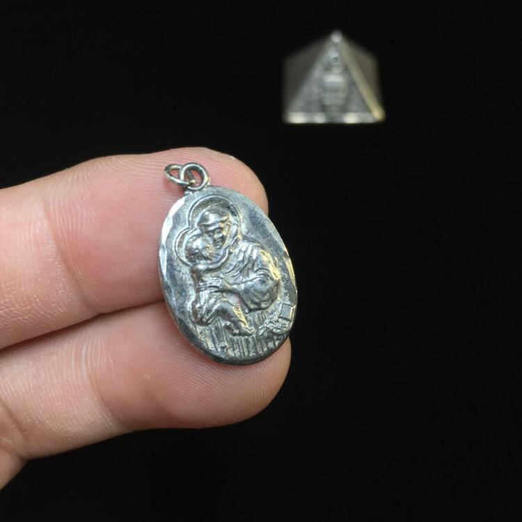 このペンダントの製作には、1940年代に信仰されていたアメリカヒキガエル信仰メダルが使用されています。聖人たちが私たちを守ってくれることを祈るスペシャルなアイテムです。