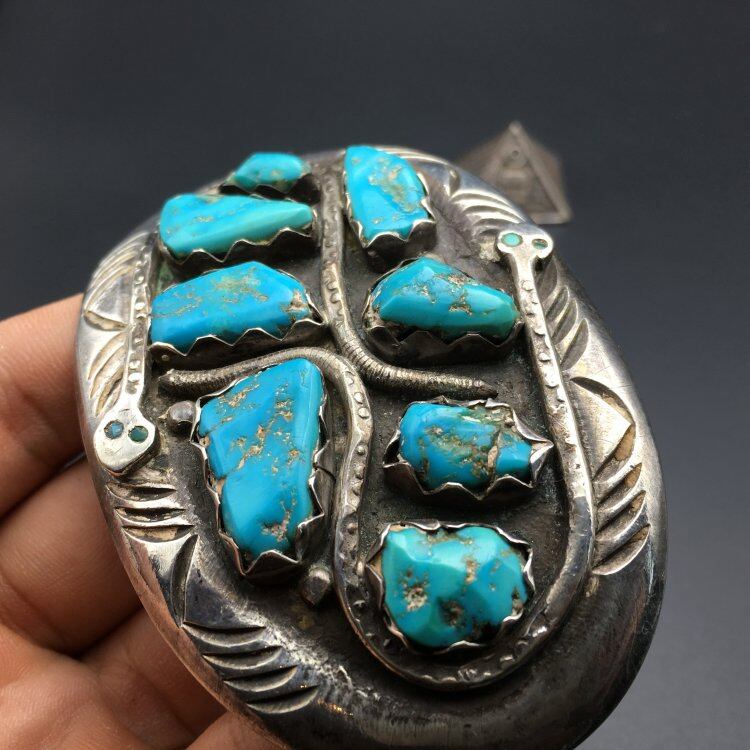 1940年代アメリカンインディアンズニースネークアイトーテムナチュラルターコイズスターリングシルバートライバルロゴアンティークベルトバックル