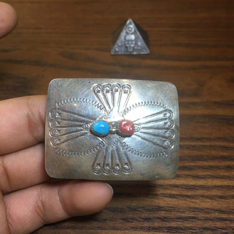 1970年代アメリカンインディアナワジョナチュラルターコイズコーラル 925 スターリングシルバーラベルアンティークベルトバックル 2.5cm