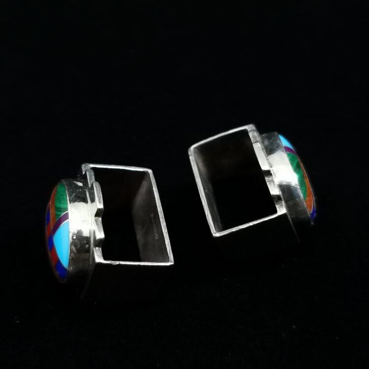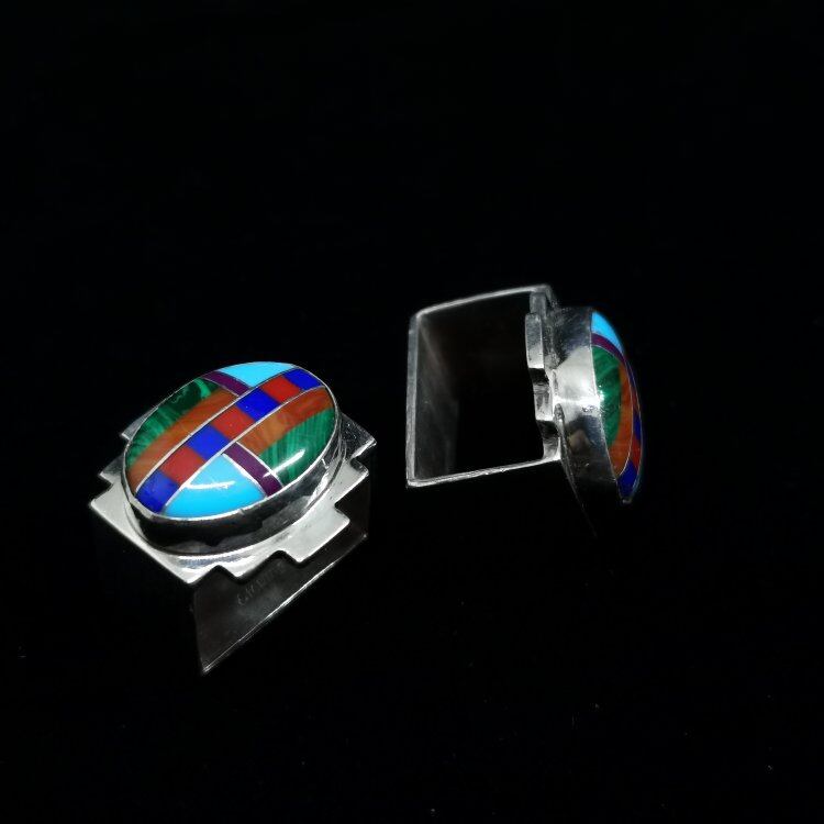 アメリカインディアンズニ族モザイク加工コンチョバックルスターリングシルバーラベルベルトリング固定バックルペア