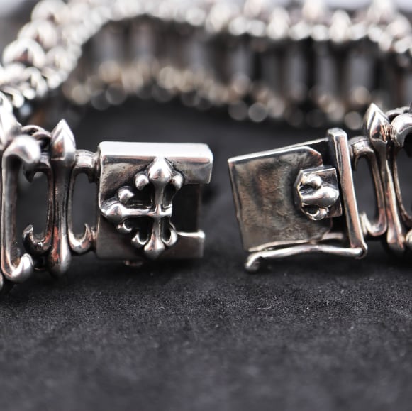 贅沢なデザインと素材で作られたIron Head Shopのタイアケニッチスタイルパッチワーククルセイダーフラワーブレスレットスターリングシルバー。職人の手によって丁寧に作り上げられたこのブレスレットは、その美しさとユニークなデザインが魅力です。
