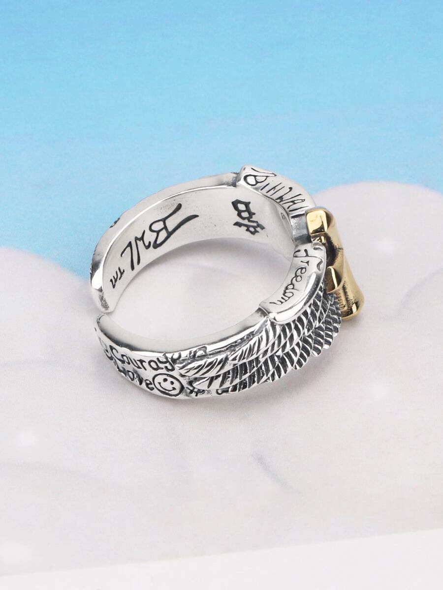 Yinshi S925 スターリングシルバートレンディーパーソナリティレトロエンジェルウィングクロスリンググラフィティスマイリーフェイストレンディー男性オープニングリング